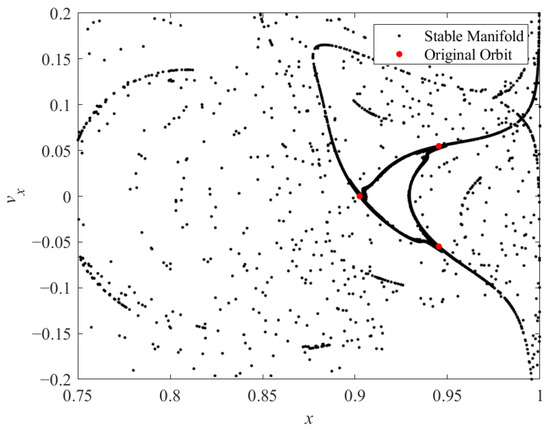 Since the manifold structures of the period-multiplying bifurcation orbits are relatively complex, we use a Poincaré section to draw the coordinates of the stable manifold crossing the plane y = 0, as shown in Figure 24, with coordinates x and vx. The red points in this figure represent the periodic orbit itself. With this information, suitable points can be selected as the starting point, according to the engineering requirement for transfer orbit design.