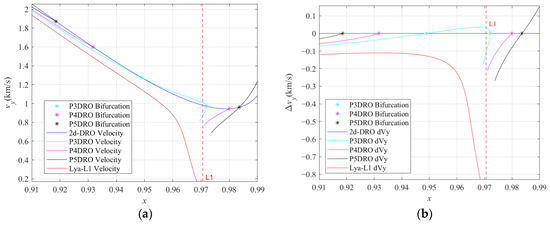 (a) Relationship between the initial position and initial velocity of different orbital types and (b) the difference in initial velocity between the DROs and the different orbital types.