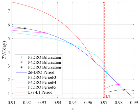 In Figure 7, a colorful curve is plotted on the stability diagram that corresponds to the DRO family. The color of each point indicates the Jacobi constant value for this orbit. In this figure, colored asterisks reflect the bifurcation points that correspond to bifurcations with the same color. Evidently, period-tripling, period-quadrupling, and period-quintupling bifurcations occur. To easily recognize these bifurcating orbits and the corresponding families to which they belong, a naming convention [33] for these new families is necessary. For period-multiplying bifurcations, the naming format is defined as follows: “PmDROn”, where “Pm” refers to the order of the period-multiplication (e.g., period-tripling is reflected as m = 3), and “n” denotes a sub-family identifier (i.e., for multiple bifurcations of the same type, the first family, in order of increasing initial position x0, is labeled n = 1, the second family is labeled n = 2, etc.). Accordingly, new families originating from period-tripling bifurcation are named P3DRO1, P3DRO2, and P3DRO3; new families originating from period-quadrupling bifurcation are named P4DRO1 and P4DRO2; new planar families originating from period-quintupling bifurcation are named P5DRO1 and P5DRO2. Employing the numerical methods stated in the previous section, all the new families of periodic orbits originating at each of these bifurcations are computed. In Section 3.2.2, Section 3.2.3 and Section 3.2.4, the bifurcating orbits and their stability are investigated to find the underlying unstable manifold structures for low-energy transfer design between DROs.