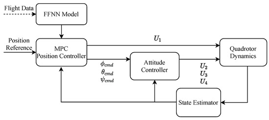 The quadrotor controller is usually implemented in the cascaded loop scheme. The outer loop controller tracks position reference with thrust and Euler angle commands whereas the inner loop controller tracks attitude reference with moments in the corresponding axis. This work focuses on the development of the outer loop position controller, which is an MPC using FFNN as the prediction model. A standard PID controller is adopted for inner loop attitude control. The cascaded control structure adopted in this work is shown in Figure 3.