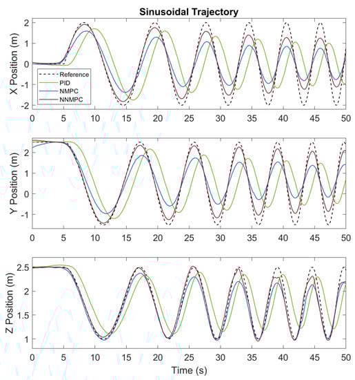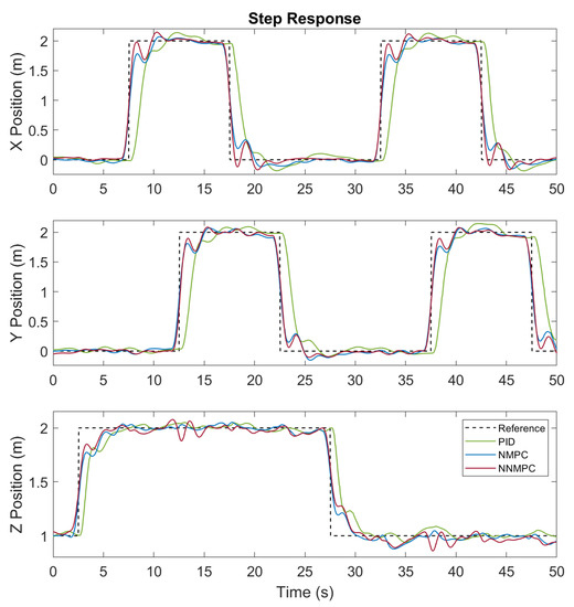 The step trajectory tracking results of PID, NMPC, and NNMPC are compared in Figure 6. Generally speaking, MPCs are superior to the PID controller because of less tracking delay. The preview feature of MPCs enables them to respond to references in advance. The MPCs have a prediction horizon of 1 s so that they actuate the quadrotor about 0.5 s before the step reference and thus result in an early step response with less tracking error.