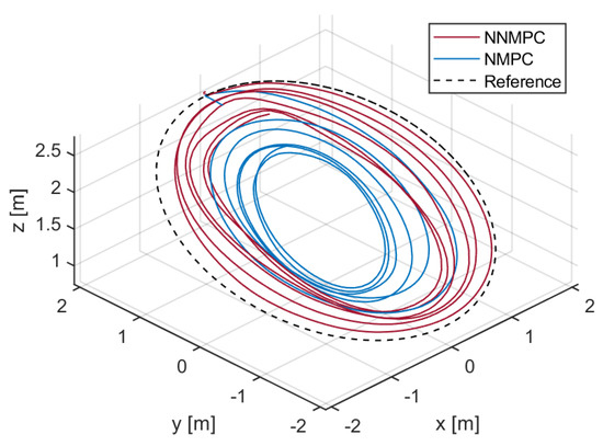 The sinusoidal trajectory tracking results of PID, NMPC, and NNMPC are compared in Figure 12. In general, the controller performances in the flight experiment are quite similar to the result from the simulation. However, in the flight experiment, the difference between NMPC and NNMPC is attenuated. NNMPC still outperforms NMPC in and directions but in the direction the performance is almost identical. In the experiment, the neural network model accuracy is compromised by the more noisy training data and thus the NNMPC performance is slightly influenced. Figure 13 shows the trajectory tracking results of NMPC and NNMPC plotted in 3D view. Because the PID results in 2 s of tracking delay, its trajectory is not plotted here. The figure shows that at relatively low velocity, both NMPC and NNMPC track the reference with good accuracy. However, with increasing velocity, the nonlinear model fails to predict the system states precisely and leads to larger tracking error of NMPC, whereas the NNMPC trajectory is closer to the reference. Table 3 shows that NNMPC reduces the RMSE of NMPC by 47% and 39% in and directions.