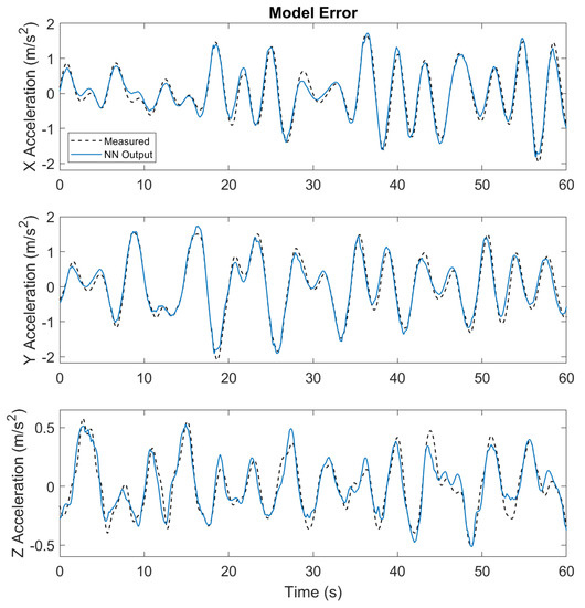 We invoke the MATLAB Deep Learning Toolbox [25] to train the network by the Levenberg–Marquardt backpropagation algorithm. The minimum gradient, number of hidden layers, number of neurons in hidden layers, and maximum epochs were set at 0, 1, 10, and 1000, respectively. The training process of such a shallow neural network with few neurons took several minutes, depending on the size of the training data. The network was trained with random initial weights and the best normalized MSE obtained was 0.00491. Once the training was complete, the network model could be expressed by substituting weights and bias in (2). Figure 5 compares the neural network model prediction outputs with the measured accelerations on the test data which were not used for training. The result indicates that the neural network model is able to predict current accelerations with given inputs to good accuracy. However, the results in and directions are generally better than those in the direction. The reason is that the collected thrust data contains high-frequency noise and data integrity could be violated during the filtering process. Because thrust is the dominant input for acceleration prediction, the result in direction is affected most by inaccurate thrust training data. For and directions, on the other hand, the dominant inputs are the Euler angles so that the results are not affected as much. We further found out that and accelerations can be accurately predicted only using velocities and Euler angles as inputs.