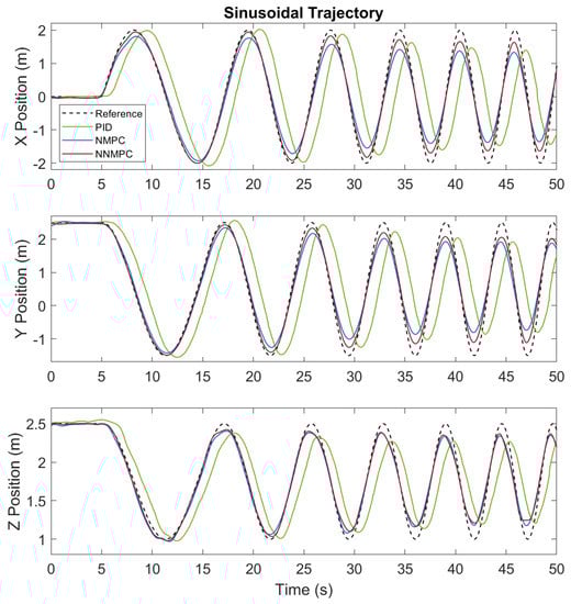 Sinusoidal trajectory tracking result for PID, NMPC, and NNMPC controllers in three axes from simulation.