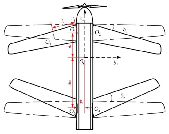 The backward sweep angle of the canards and the forward sweep angle of the wings are defined as δ1 and δ2, respectively, as shown in Figure 2. When the MAV morphs from loitering configuration to dashing configuration, δ1 and δ2 increase according to a law that can maintain flying stability. Ob is the mass center of the fuselage, Oa is the mass center of each airfoil, l is the distance between the rotation center and the mass center of each airfoil, ac and aw are the distances between Ob and the rotation center of the canards and wings in the xb axis, respectively, and bf and c are the distances between Ob and the rotation center of the airfoils in the yb and zb axis, respectively. The main MAV geometric parameters and mass properties of the no-sweep configuration are shown in Table 1.