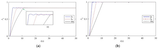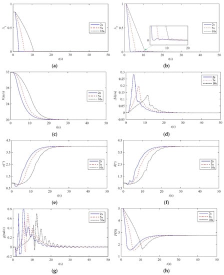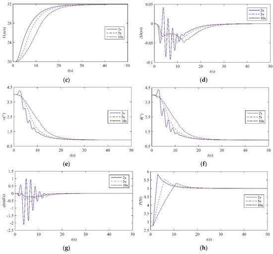 Figure 8 shows the close-loop dynamic responses of the transition process from loitering configuration to dashing configuration within 2 s, 5 s, and 10 s, respectively. The morphing starts with an initial flight velocity of 20 m/s at 1 s. As the morphing occurs, the flight velocity, V, increases and then converges to 31.9 m/s gradually, which corresponds to Condition 4 after the morphing finishes. Furthermore, the attack angle, α, and pitch angle, θ, are also convergent to the new equilibrium state. During the whole transition process, the variation range of altitude, h, is less than 0.1 m, and h eventually retains the initial height. In addition, it is worth noting that the close-loop system with the three different morphing rates are all stable during the transition process, and the faster morphing rate would result in a faster convergence rate as well as a larger oscillation amplitude of the state parameters. After the morphing command finishes, the sweep input, λ2, remains almost constant due to the actuator saturation restriction, while the λ1 and thrust, P, would continue to adjust until achieving a new balance. Moreover, λ1 and thrust, P, both vary within acceptable ranges for the different morphing rates, which demonstrates that the gain scheduled controller can realize the transition control objective for situation 1.
