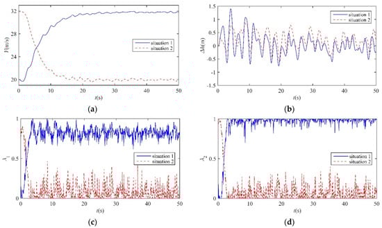 The dynamic responses of the transition process under white noise condition. (a) V; (b) Δ h; (c) λ1; (d) λ2.