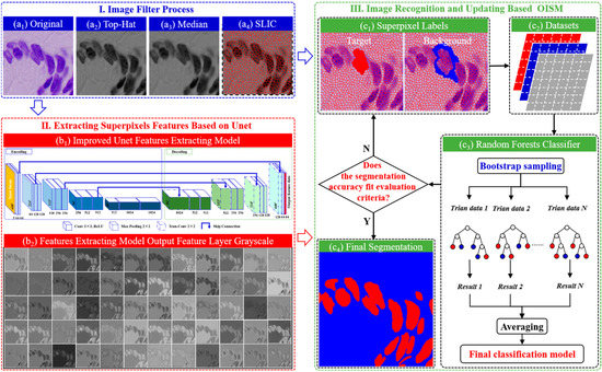 The framework of the proposed OISM is displayed in Figure 1, which including (I) image filter processing, (II) extracting superpixels features based on the Unet, and (III) image recognition and updating according to the OISM.
