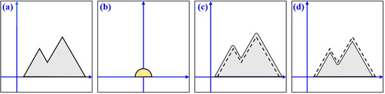 The description of dilation and erosion operations. (a) original image; (b) the structuring element; (c) the processing result of dilation operation; (d) the processing result of erosion operation.