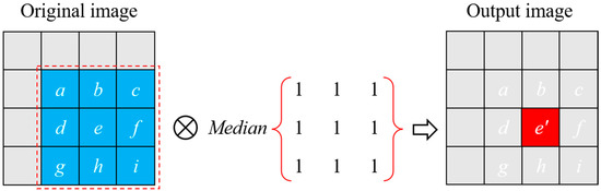 The Median filter is one of Sequential statistical filters, which can replace the target pixel value with the median gray value of its neighborhood. It is applied to reduce the salt and pepper noise of images and explained by Figure 3.
