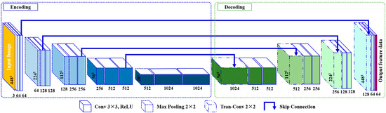 After the image filtering and SLIC superpixels algorithm processing, the Unet feature migration model is used to extract the superpixels feature dataset. As shown in Figure 4, the improved Unet model is applied to extract the multi-dimensional feature information of input images and enhance the super-pixel features. In the improved Unet model, we change the stride and the kernel size of padding of Conv2d to make the input image and output results to be the same in the Pytorch frame. The size of the input image is 4482 and the number of the channels is 3. To obtain the multi-scale feature datasets, the same-level layers’ features of encoding and decoding are combined in the skip connection. In addition, we clip the final layer of the improved Unet model to retain the 64-dimensional pixel feature matrix.