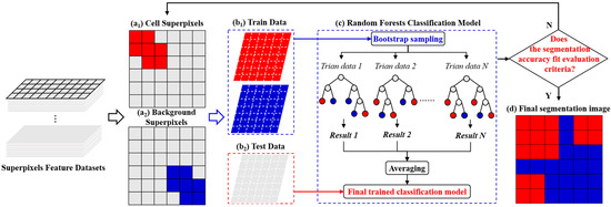 Flowchart of optimizable image semantic segmentation with RF classifier. (a1) and (a2) are the labeled cell and the background class superpixels of the image; (b1) and (b2) are the train data of labeled superpixels and test data of non-labeled superpixels of the image; (c) is the superpixels classifier based on the RF; (d) is the final segmentation image.