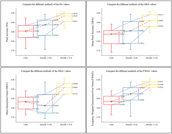 (1) Compared with the IQR values of PA, MPA, MIoU, and FWIoU, the data of the improved Unet is smaller than that of the OISM (K = 0.8%), while it is bigger than that of the OISM (K = 5.0%). Thus, it shows that the accuracy of the OISM is more concentrated with the increasing of K value.
