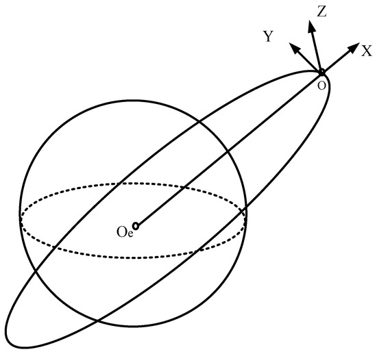 To describe the relative position and velocity of two spatial objects, a reference coordinate system is first defined as the orbital coordinate system (Figure 1). The earth center, , is the origin. The origin of the orbital coordinate system is the centroid of the space-based platform. The X-axis is in the direction of the earth center to the space-based platform. Y-axis points in the velocity direction of the space-based platform, and it is perpendicular to the X-axis on the orbital plane. The Z-axis points in the normal direction of the orbital plane. The coordinate system is a right-hand system. A typical relative position of the space-based platforms and the non-cooperative targets are plotted in Figure 2.