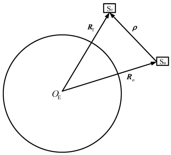 In Figure 2, is the space-based platform or the observer, is the non-cooperative target, and are the position vectors of the space-based platform and the non-cooperative target, respectively. The relative position vector is defined as . According to the vector differential method in the dynamic coordinate system, the second-order derivative of the relative position vector is,