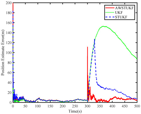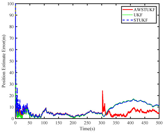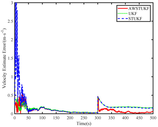 In case 2, for the target spacecraft, the magnitude of the pulse maneuver is 0.5 m/s, which is smaller than in case 1. The purpose of this setting is to test the performance of the methods regarding a small pulse maneuver. The maneuver occurs at 300 s, and the pulse maneuver is along the direction of the velocity. The position estimation errors and the velocity estimation errors of the three methods are provided in Figure 5 and Figure 6, respectively. It can be observed that the position and velocity estimation errors of the three methods are basically the same before the maneuver. After the small maneuver, the state estimate error in the proposed AWSTUKF method is reduced faster than in the other two methods. When a small pulse maneuver occurs, the STUKF fails to detect the maneuver due to the residual orthogonality is not consistent with the actual measurement, which results in the fading factor always equal to 1 The STUKF method degenerates into the UKF method. The AWSTUKF method uses the adaptive method to calculate the weight of the measurement information to improve the sensitivity of the system. At s, the small pulse maneuver was detected successfully, the fading factor rapidly enlarges the covariance matrix, therefore the filter converges quickly.
