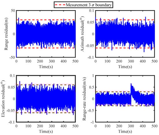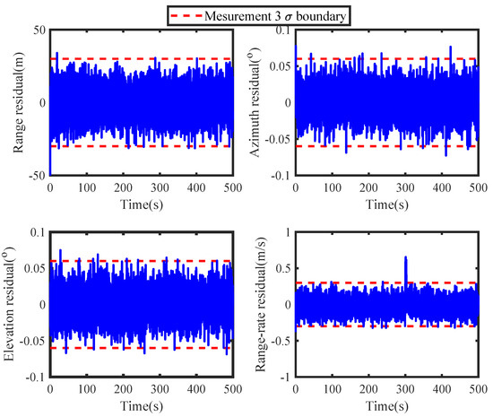 The residual variation of the proposed AWSTUKF method and the STUKF in case 2 are presented in Figure 7 and Figure 8. It can be observed that the residuals of ranging and angle measurement of the two methods have no large changes before and after the maneuver. The range rate increases rapidly when the maneuver occurs and it begins to converge after the maneuver. This showed that the residual orthogonality of the two methods changes after the maneuver, and the filtering gain needs to be changed by adjusting the fading factor. The orthogonality of the residual sequence also needs to be ensured. Compared with the STUKF method, because the weight is calculated in real-time, the convergence is achieved faster in the AWSTUKF method.