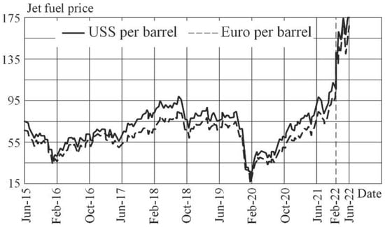The pandemic has further adjusted the problem of increasing fuel efficiency. The decrease in income of the people forces air carriers to think more and more about reducing the cost of air travel. Fuel costs can take 25% to 35% of direct operating costs. Additionally, the political environment in 2022 significantly impacts the cost of all energy resources, including aviation fuel—Figure 1.