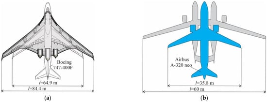 Existing and prospective aircraft with the same range and passenger capacity, but with greater fuel efficiency: (a) Boeing 747 and mixed wing-fuselage aircraft []; (b) A320neo and its two-fuselage counterpart [].