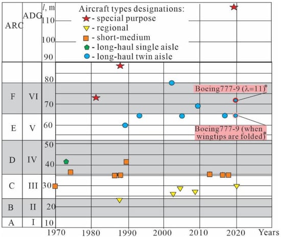 Evolutionary aircraft wingspans and categories of airports and aircraft []. * For the Boeing 777X aircraft, two wingspans are shown: “ground” and “flight”.