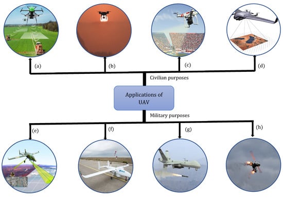 Applications of UAVs in: (a) agriculture [11], (b) monitoring and data collection (pollution and land monitoring) [12], (c) photography (film, video) [13], (d) aerial mapping [14], (e) reconnaissance [15], (f) surveillance of enemy activity [16], (g) attack missions [17], (h) decoying missiles by the emission of artificial signatures [18].