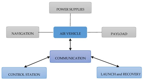 The UAV system is made up of many different components. Depending on the requirements of the mission, parts of the UAV may be changed. However, they basically include the following subsystems: navigation, air vehicle, payload, communications, launch, recovery and retrieval equipment, and control station. These subsystems do not exist in isolation but are parts of a total system. The structure of the UAV can be seen in Figure 2.
