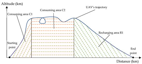 Figure 3 shows a UAV flight scenario. During the flight from the starting point to the ending point, the UAV consumes a lot of energy in the C1 and C2 areas and stores the energy back by converting wind energy into electric energy in R1 area. In order to achieve the goal of generating the maximum of the UAV coefficient of efficiency, it is necessary to find the efficient coefficient of wind energy to electric energy conversion. Since the UAV is affected by environmental factors and the variable speed of the motors, the power consumption model of the UAV is in fact a nonlinear model. The energy consumption model will become complex due to many parameters to be considered. However, our aim is to find the maximum efficiency; therefore, in this paper, the energy consumption model will be considered in linear form.