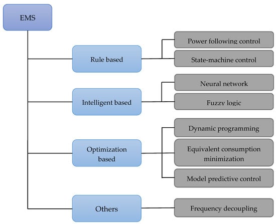 Hybrid systems combine the advantages of different energy sources and balance their limitations, resulting in a significant increase in system performance. It is therefore very suitable for use in powering UAV systems. In EMS, power needs to be optimally split between power sources to achieve high performance of the system and efficiency of energy usage. The EMS can be mainly considered as follows: rule based, intelligent based, optimization based, and others (shown in Figure 7).