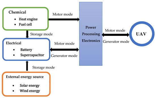 The power system plays an important role in the UAV and is seen as the heart of the system as it supplies power for the whole operating system. The power system has a significant effect on the flight performance of an aircraft. The power sources for UAV operation mainly include heat engine, fuel cell, supercapacitor, battery, and external energy source (solar, wind, etc.). They are divided into two categories: chemical system and electrical approaches (shown in Figure 9).