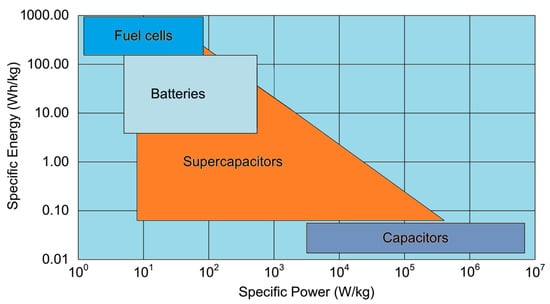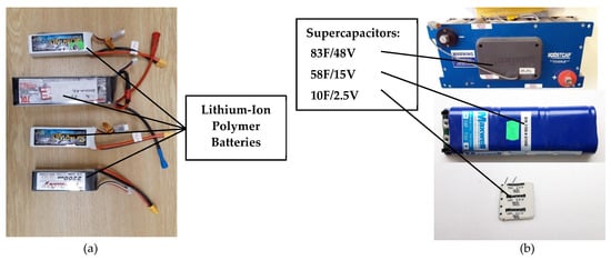 Electrical power has many advantages, such as reliability, no pollutant emission, high efficiency, low noise, self-starting feature, and a well-developed control system. Among the sources of electrical energy used on the UAV, the battery (Figure 11a) is the most commonly used one to power the system due to it cost-effectiveness, simplicity, and flexibility. However, batteries still have some limitations, such as low energy density and a long time to charge. In addition, in some cases of requiring a fast power response for the UAV’s maneuver, the battery is not a good choice due to its slow power dynamic. To compensate for these drawbacks of the battery, using supercapacitors (see Figure 11b) could be considered when it has much higher power and can be a faster energy storage system (faster charge/discharge rate) compared with a battery. A supercapacitor also has a reasonable cost, a large operating temperature range, and a low maintenance cost and reduces the DC bus voltage fluctuation. However, in comparison with batteries, supercapacitors have lower specific energy capacities (only a few Wh/kg). Among supercapacitors, electrical double-layer capacitors are the most common types, which are very durable and capable of fast charging and discharging and have millions of cycles.