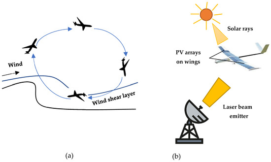Non-EMF-based techniques: (a) gust soaring; (b) PV arrays and laser beaming.