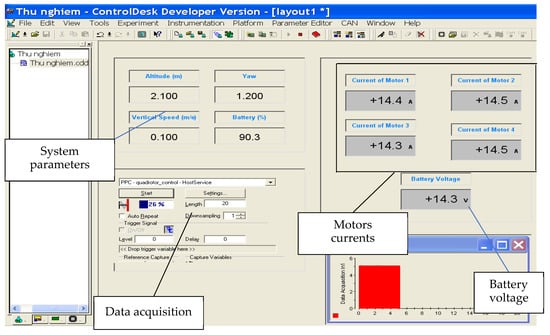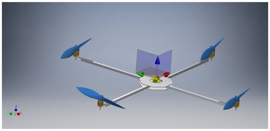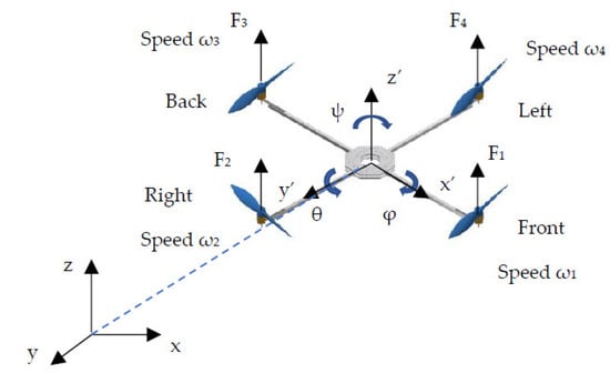 where, is an essential parameter to control the quadrotor reaching the desired attitude; control the roll, pitch, and yaw displacement, respectively; is the moment of inertia of the rotor; and Ω is the overall sum of rotors’ speed.