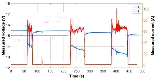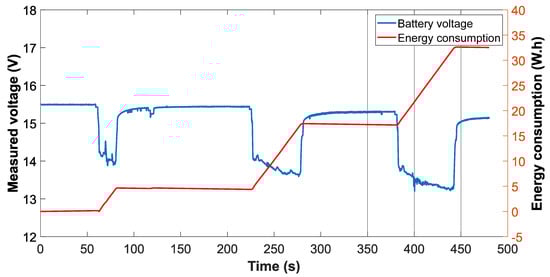 The second flight had a flight that lasted up to 55 s. The battery voltage at the start of the second flight was 15.37 V in comparison with 15.49 V of the first flight. During the flight, the battery voltage dropped to as low as 13.65 V, and at the end of the flight, it recovered to 15.2 V. The energy consumed for this flight was approximately 13 Wh. In the case of the third flight, the flight time of the system was 54 s. Around the 400th second, the amperage suddenly increased to nearly 100 A because, during the flight, the system performed the flight to a height of more than 0.2 m and then returned to a height of 2.5 m. The amount of energy the system consumed was 15.5 Wh in this third flight. The voltage of the battery dropped to the lowest value of 13.3 V and returned to the value of 15.1 V (see Figure 26).