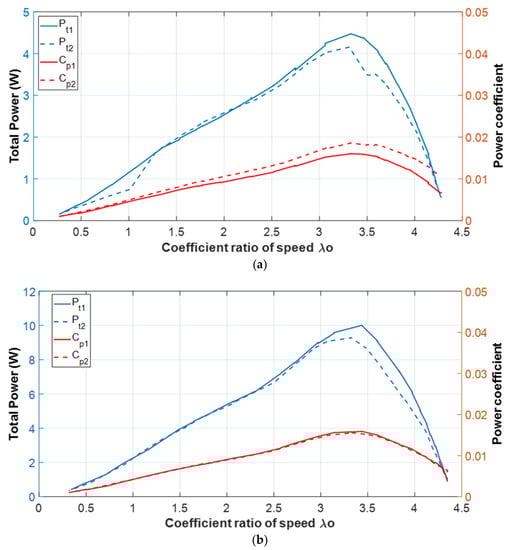 In Figure 27a, the value of the total powers obtained from the experiment with a wind speed of 12 m/s increased and reached the maximum values of 4.4 and 4.1 W as the coefficients of ratio speed had values of 3.3 and 3.31, respectively. In Figure 27b, in the case of a wind speed of 15 m/s, the maximum values of the total powers that can be obtained were 9 and 10.1 W. By using Equations (18)–(23), it was possible to calculate the efficiency of wind energy to electric energy conversion. Figure 27 shows a comparison of the coefficient of efficiency 𝜂o in the cases of symmetrical and asymmetrical loads of a three-phase generator.
