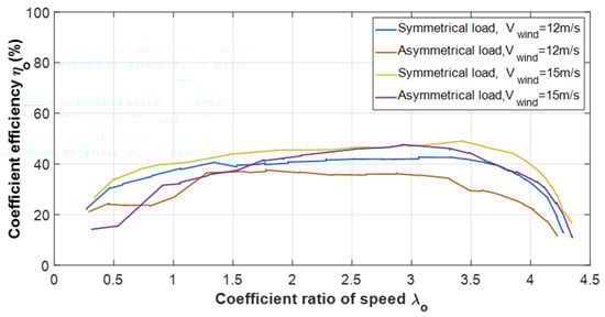 It can be seen from Figure 28 that the coefficient of efficiency in the case of symmetrical load became a better value in comparison with the case of asymmetrical load. With a wind speed of 12 m/s, the coefficient of efficiency reached the highest values of 37.2% and 42.8% when the coefficients of ratio of speed (λ0) were 1.55 and 3.1, respectively. In Figure 28, the maximum values of the coefficients of efficiency were 49.1% and 47.3 as λ0 = 3.44 and λ0 = 2.91, respectively, in the case of a wind speed of 15 m/s.