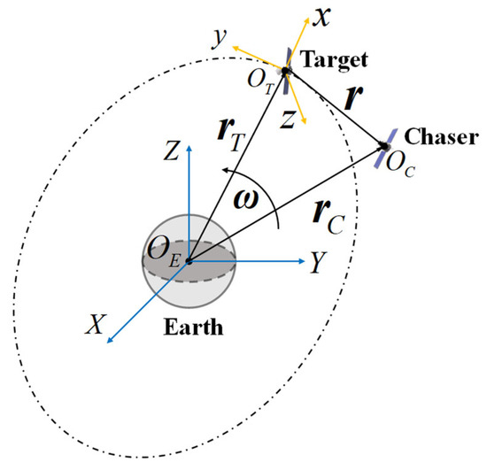 Figure 1 also contains the geocentric equatorial inertial (GEI) coordinate system, which sets its origin at the center of the Earth , the X-axis point in the vernal equinox direction, and the Z-axis point in the direction of the North Pole. The Y-axis is in the equatorial plane and completes the right-hand rule. The vector positions of the Chaser and Target relative to the center of the Earth are denoted by and , accordingly. The angular velocity of the Target is given by the vector , and the scalar indicates its magnitude. Therefore, the vector position of the Chaser satisfies