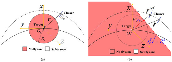 Setting a no-fly zone is a crucial step in ensuring the safety of the proximity process. The no-fly zone constraint in Problem 1 is defined in the LVLH coordinate system, as shown in Figure 2a. The magnitude of the position vector also represents the distance between the two spacecraft, as the origin is set at the Target centroid. The distance must at least meet the minimum safe distance, , to avoid collisions.