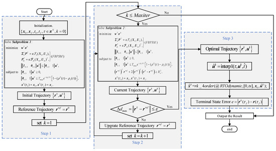 For Problem 2, the linear time-varying system (LTV) in Equation (29) can be converted from a continuous infinite dimension to a discrete finite dimension by some discretization methods, including the zero-order hold (ZOH), first-order hold (FOH), the Runge–Kutta (RK) method, and the global pseudospectral (PS) method [26]. After discretization, Problem 2 with the convex constraints can obtain the optimal solution by solving a convex programming problem in each iteration until the convergence criterion is satisfied, via the sequential convex (SC) method. In this study, the PS method based on the Birkhoff interpolation is combined with the SC method to solve the RTO problem.