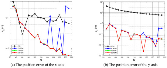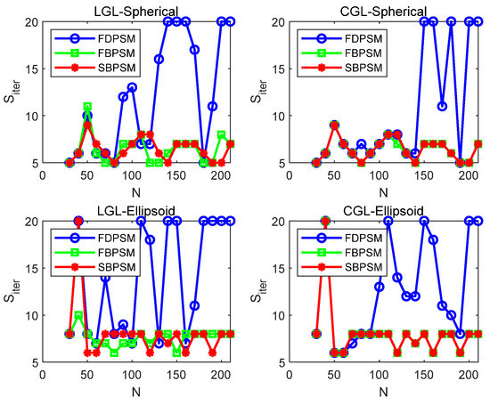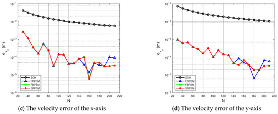 Generally, the distribution characteristics of the Chebyshev–Gauss–Lobatto (CGL) grid points cluster at both ends and are sparse in the middle. As a result, when N is too small, there are few interpolation points near the no-fly zone, causing the trajectory to directly cross this area, as illustrated in Figure A5. Finally, the optimal trajectory fails to meet the no-fly zone constraint, and the two satellites may collide in the close-range rendezvous mission. There are enough interpolation nodes close to the no-fly zone’s boundary when is a suitable value. Through the successive iterative optimization process, the Chaser satellite avoids the no-fly zone along the optimal trajectory and reaches the endpoint, as shown in Figure A6. The results and conclusions obtained by using the FBPSM and SBPSM are consistent with the above findings using the FDPSM. Therefore, after assessing the computational efficiency and precision of the solution, the Birkhoff pseudospectral method is unquestionably a better option when the number of grid points must be raised to satisfy the requirements.
