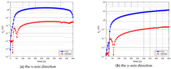 Figure A7 depicts the variation curve of the component and the magnitude of the Chaser’s thrust when the number, , is taken as 30 and 120, respectively. First, from the two subgraphs on the right, it can be found that the slack variable, , is completely consistent with the change curve of the thrust magnitude, . This illustrates that the lossless convexity operation is effective and verifies that the solution of the relaxed Problem 2 is equivalent to the original Problem 1. From the subgraphs of the thrust component, it can be found that the thrust mainly acts on the -axis and the -axis, which is also in line with the characteristics of the maneuvering transfer in the plane, with minimum fuel consumption. Moreover, when the number of grid points is small, the change in thrust is relatively stable and slow, especially when passing through the no-fly zone, when the working time of the whole engine is about 80 s. In sharp contrast, when is 120, the satellite makes a rapid maneuver response when approaching the no-fly zone, which lasts only 15 s. From the previous result analysis, it is known that, in the end, the former mission failed, while the latter perfectly avoided the no-fly zone and reached the destination.