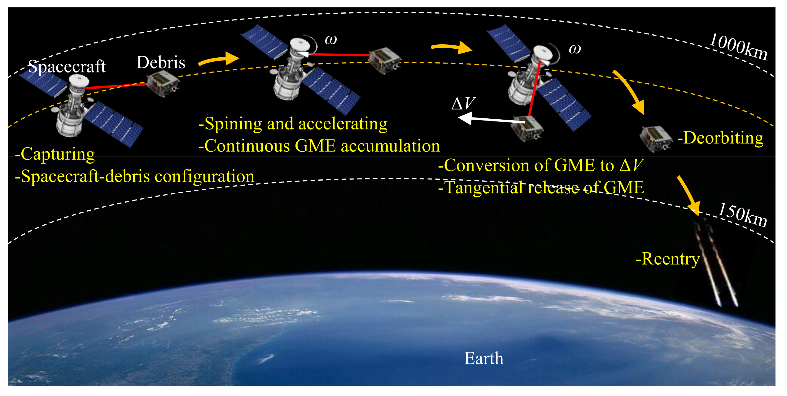 - Compared with the existing propellantless deorbiting methods, the proposed approach has higher efficiency and lower dependence on the scale for the LEO debris deorbiting [41,42]. To deorbit a LEO (product of debris mass and scale of deorbiting mechanism) debris, days to weeks (tens to hundreds of orbital period) of preparation is required with the existent magnetorquer technology, as depicted in Table 1.