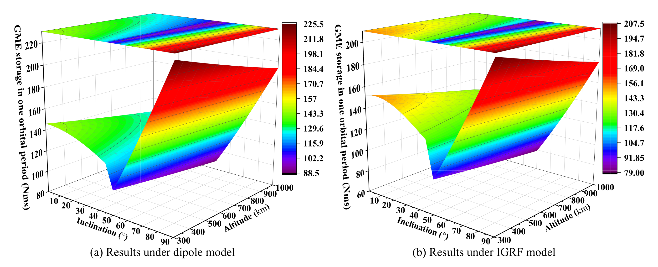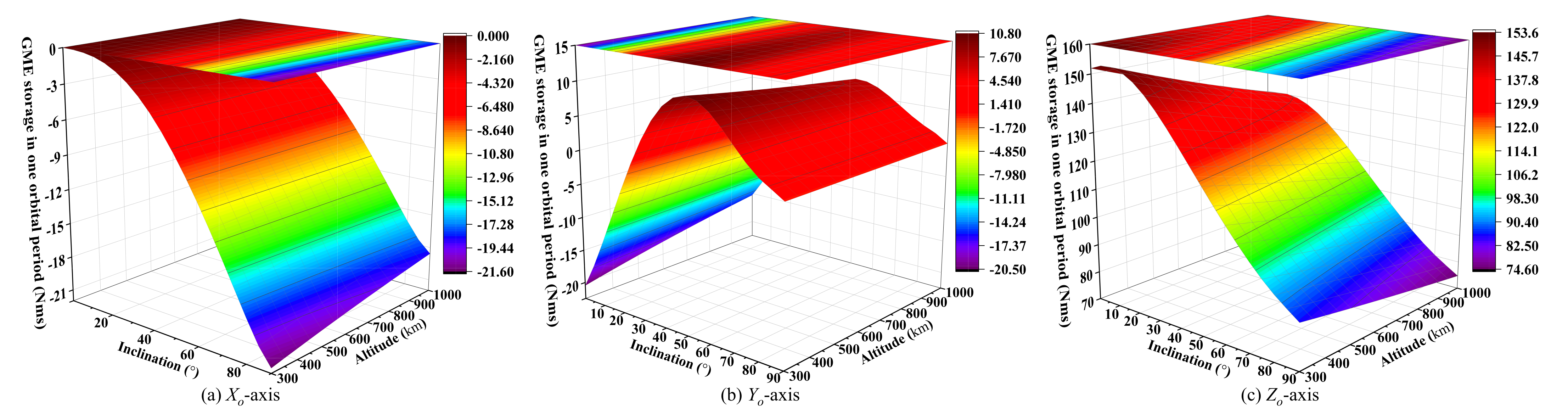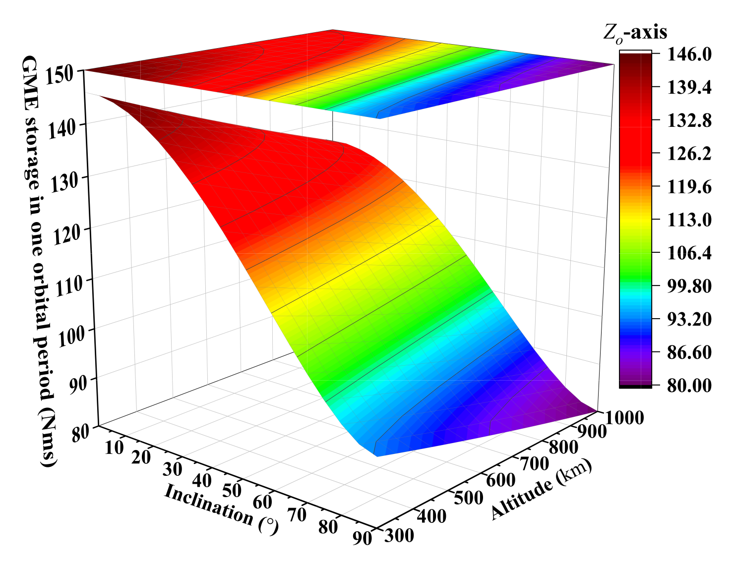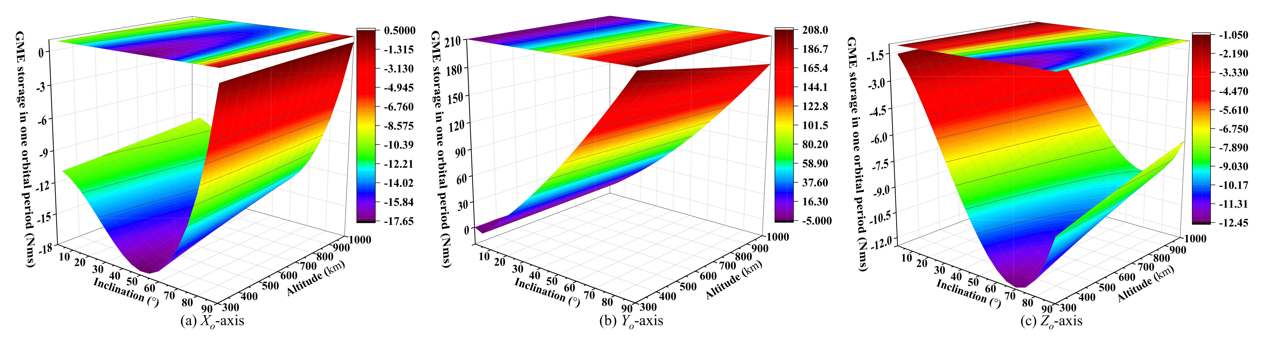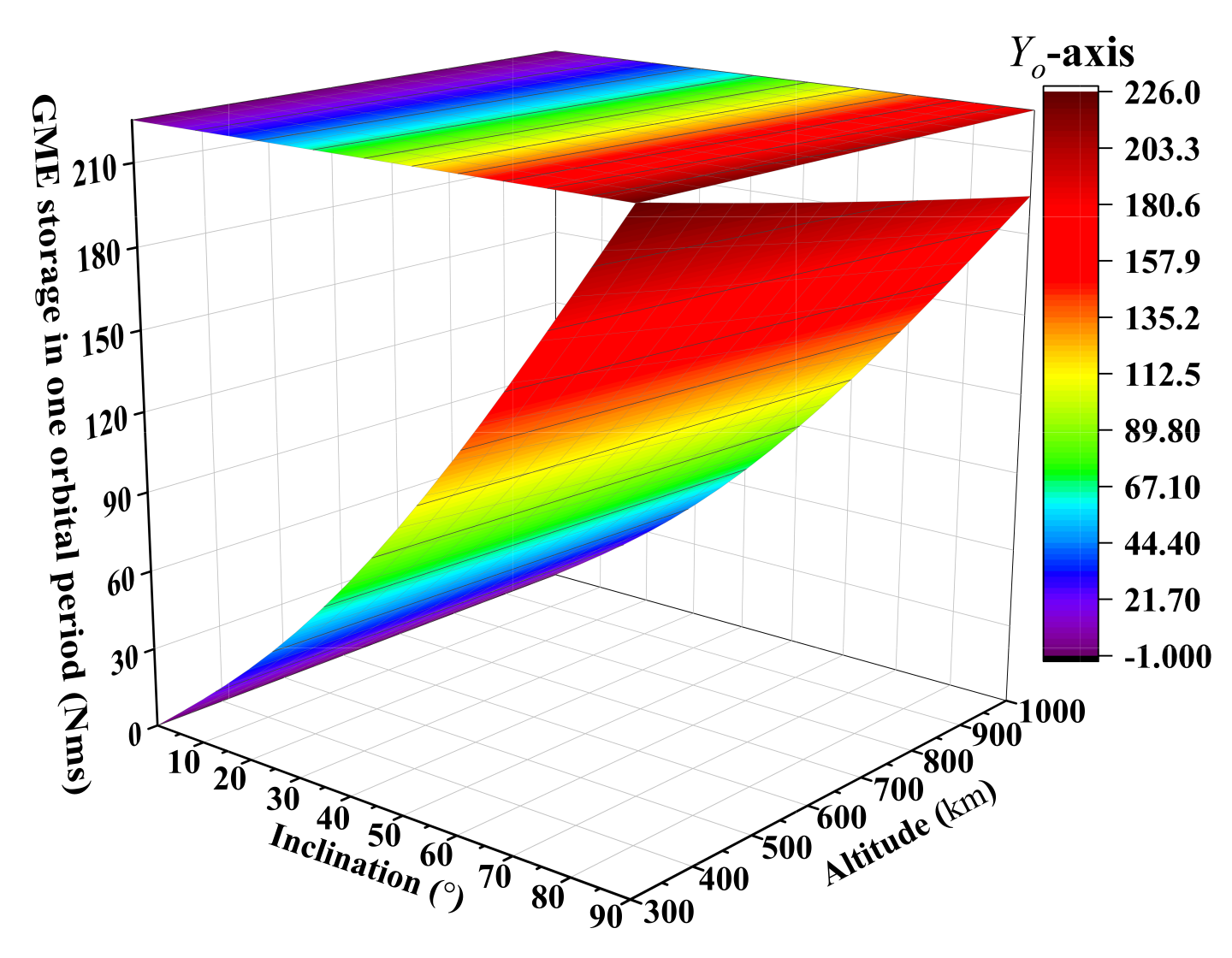 - The GME propellant approach can be applied to the region of LEO below 1000 km with different altitudes and inclinations, and it is consistent with the analysis results in Section 2.5. As seen in Figure 6 or Figure 7b, the strategy at the -axis, Equation (12) or (14), has an obvious advantage on the orbit with a large inclination, but does not have the energy storage capacity for equatorial orbit. From Figure 8 or Figure 9c, the strategy at the -axis, Equation (13), can be used for the entire LEO below 1000 km. With the combination of Figure 6, Figure 7b, Figure 8 and Figure 9c, we know that when , the strategy of GME storage at -axis is adopted; otherwise, the choice of strategy at the -axis is reasonable. So the Figure 10 is presented to show the energy storage capability of the GME propellant approach.
