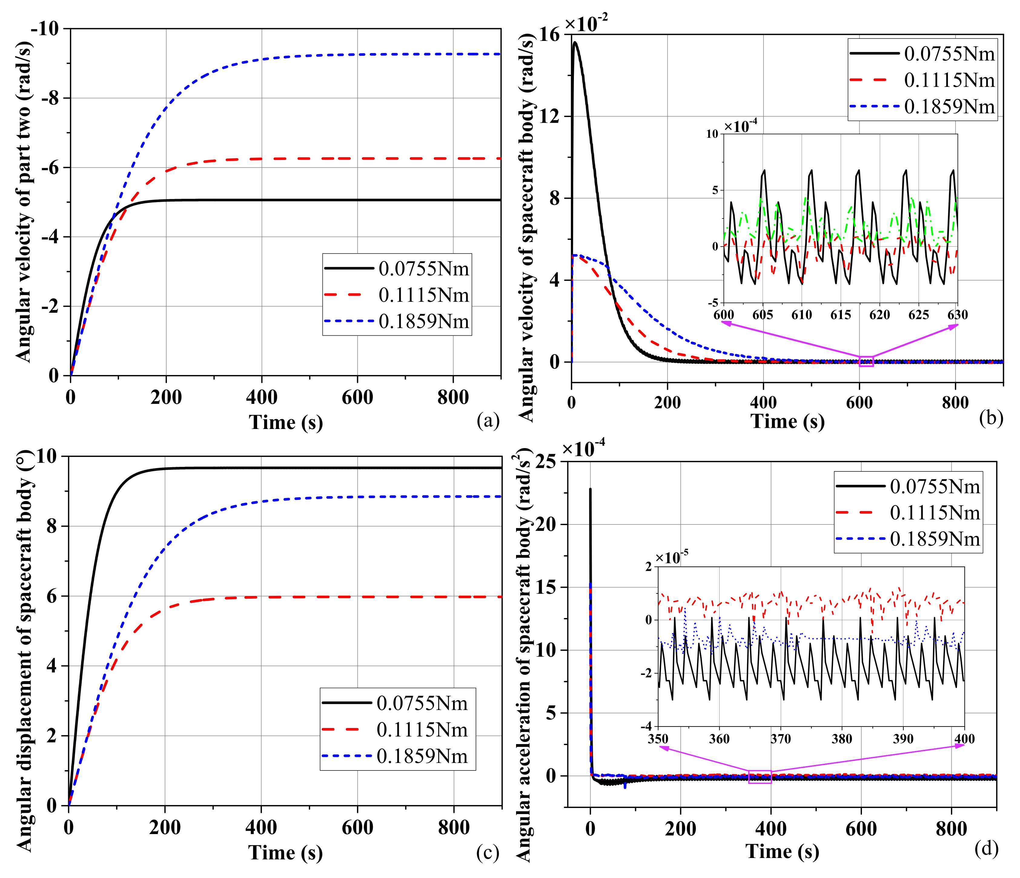 - The attitude holding of part one (spacecraft body) is well satisfied, which is in good agreement with our expectations. As depicted in Figure 13b,d, the peak of angular velocity and acceleration occurs only at the initial time, and the angular displacement is approximately from to , shown in Figure 13c.