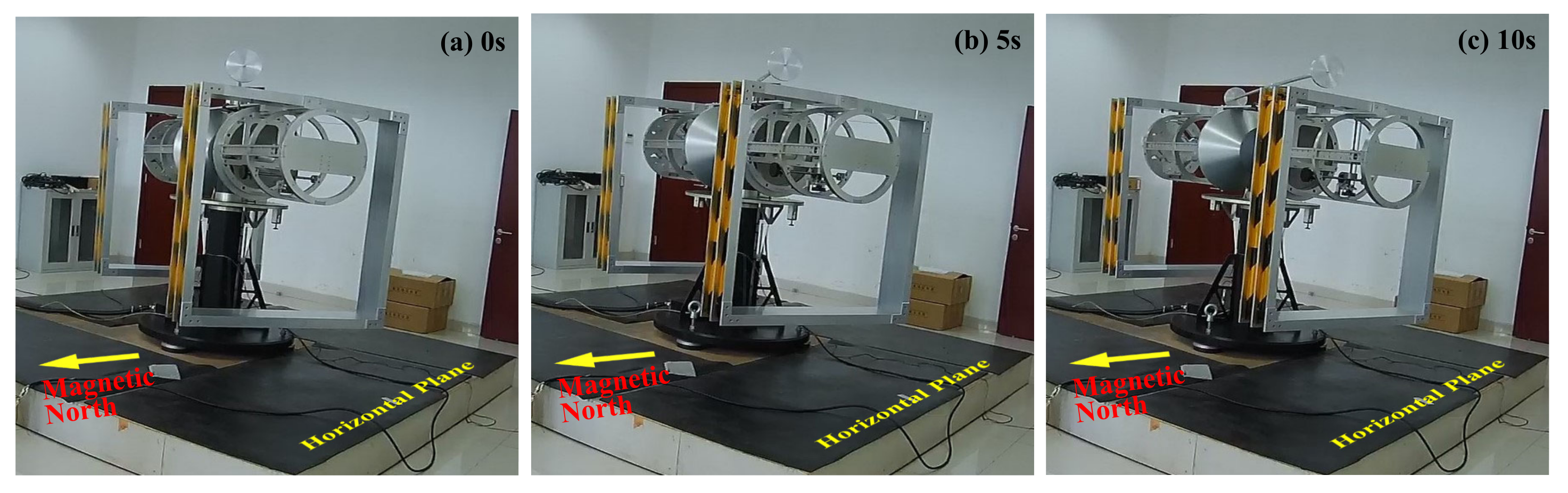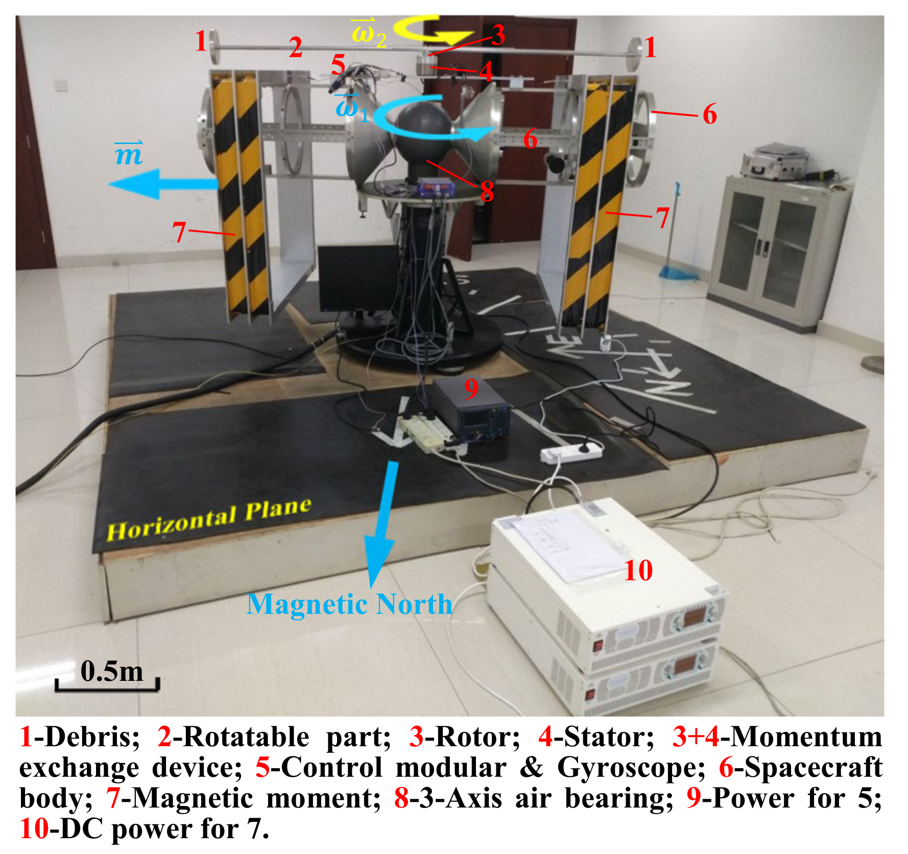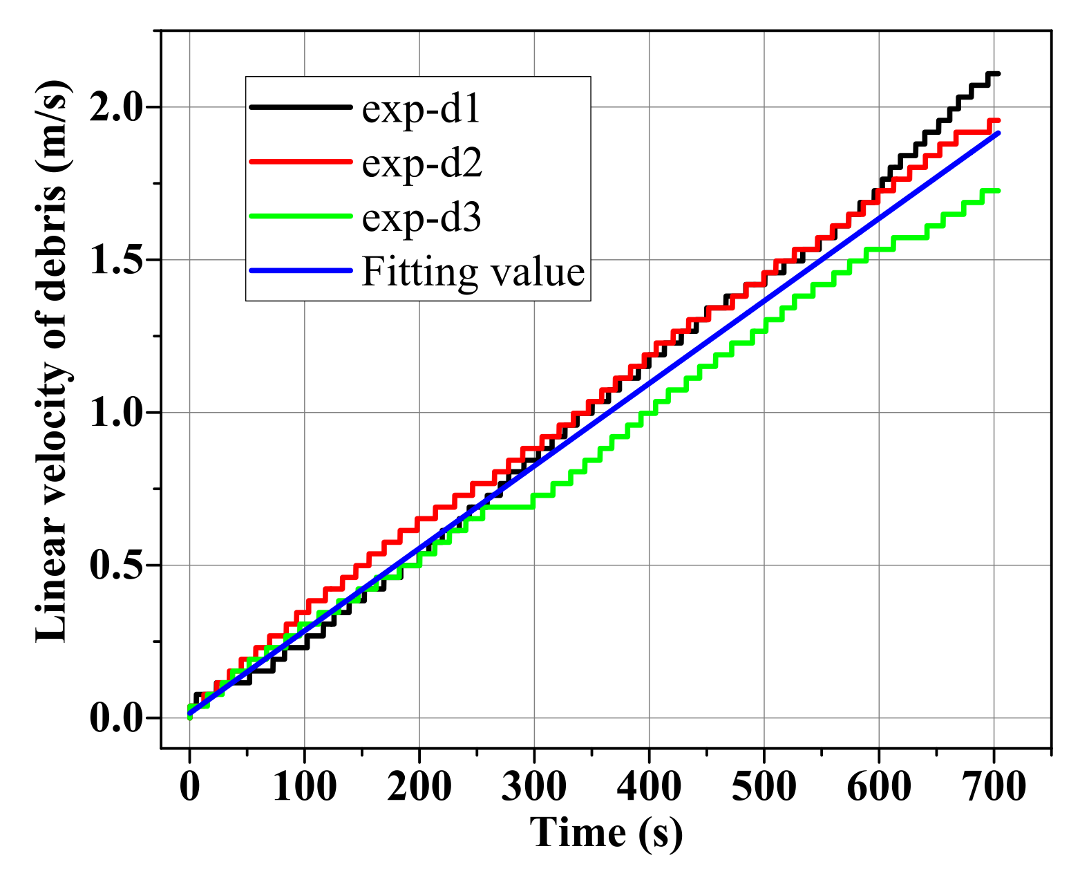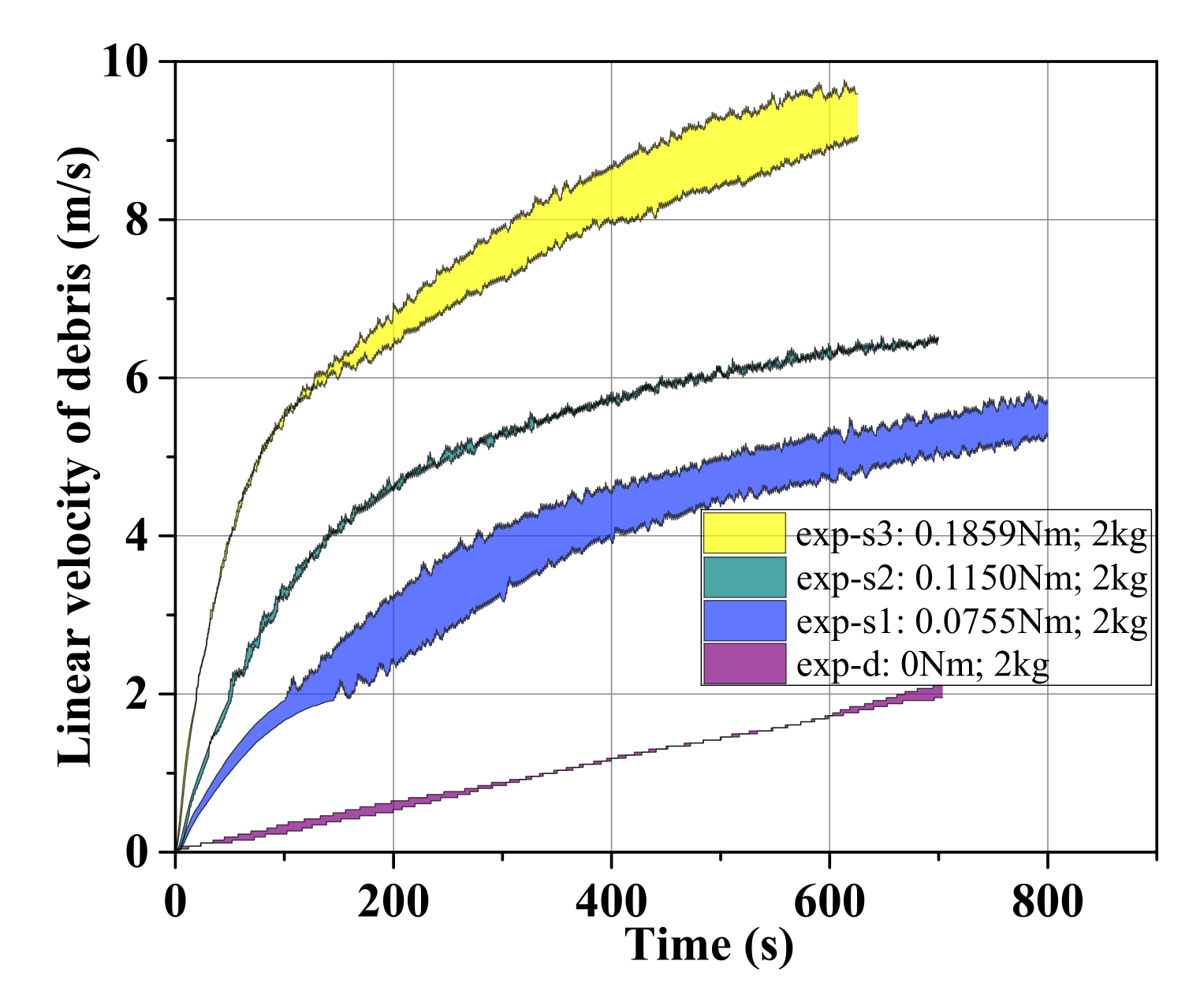 - The effect of continuous GME storage is noticeable. After the coils and momentum exchange device are electrified, there is a clear sustained acceleration tendency of debris, and the tendency is apparently different under different DC current (magnetic torque), as seen in Figure 19. In about 10 min, the linear velocity of the two debris reaches the final of with a total debris.