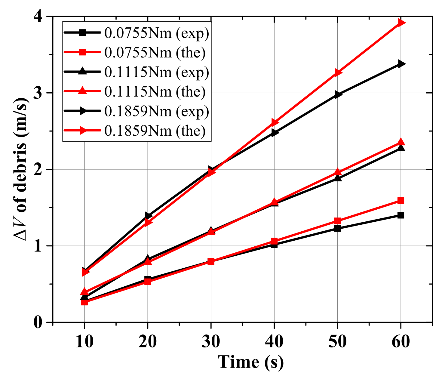 - The measured value of velocity increment coincides well with the theoretical calculation, and the mechanism of directional energy storage is verified. At the beginning of each experiment, the velocity of the debris is relatively little, and the effect of the disturbance torque and air aerodynamic torque on the angular momentum accumulation of the system is negligible compared with that of the magnetic torque. Hence, the measured in the initial 60s is taken out here to compare with the theoretical value (see Table 4 and Figure 21). The experimental is in well accordance with the theoretical result, and with the increase in velocity, the deviation of them gradually appears due to the effect of the disturbance torque and air aerodynamic torque.