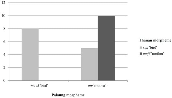 Interestingly, the Austroasiatic languages Thanau and Palaung showed a slightly different pattern from the Tibeto-Burman and Tai-Kadai languages, in having an additional morpheme, possibly meaning ‘mother’, that also formed binomial compounds in bird names. While Palaung had a greater proportion of binomial compounds with the morpheme ‘mother’ (61%) compared to ‘bird’ (27%), the reverse trend was observed for Thanau, with the ‘bird’ morpheme being more common (Table 3). However, analysis of the mapping of the ‘bird’ and ‘mother’ morphemes between Thanau and Palaung revealed a somewhat overlapping distribution. Figure 1 shows that, among the birds named in both languages, those that have binomial Palaung names incorporating the morpheme mɐsĩ ‘bird’ exclusively have Thanau binomial names incorporating the morpheme sɐn ‘bird’. The relationship between the Palaung and Thanau binomial names incorporating the morpheme ‘mother’ is weaker, but the general trend is for the same morpheme to be used for a particular bird in both languages.