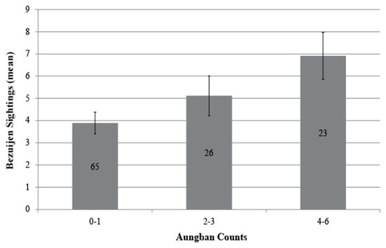 Graphical depiction (mean ± SE (Standard Error)) of the association between the number of languages in which a stimulus bird species was identified and named (x-axis), and the number of sightings of that species by birdwatchers in the Bezuijen et al. study [14] (y-axis). Birds with names in a majority of languages (4–6) were sighted more frequently by birdwatchers. Numbers inside the bars show counts for each category.