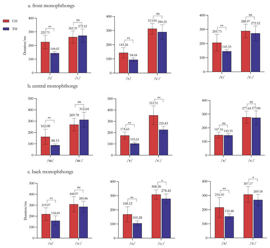 Durations of monophthongs (* = significant level < 0.05, ** = significant level < 0.01, ns = non-significant, and hereafter).