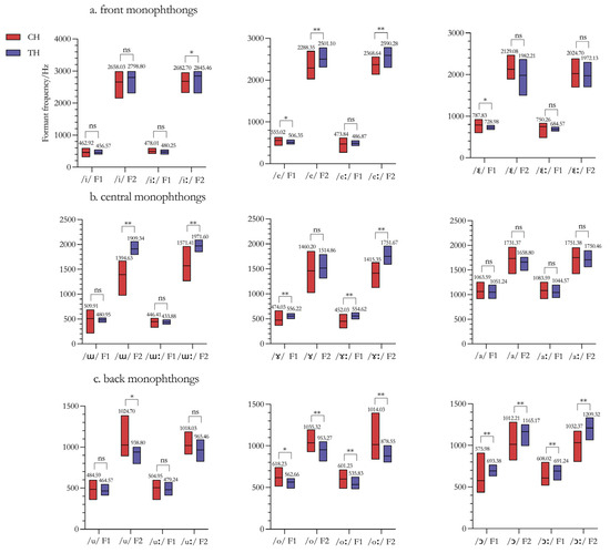 Formant frequencies of monophthongs (* = significant level < 0.05, ** = significant level < 0.01, ns = non-significant, and hereafter).