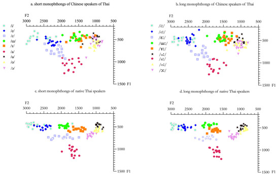 In addition to the mentioned differences in formant frequencies, Figure 5 below also illustrates the articulation places of short and long monophthongs produced by Chinese students of Thai (panels a and b) and native Thai speakers (panels c and d). The y-axis represents the F1 values, while the x-axis corresponds to the F2 values, allowing for a visual representation of the monophthong positions in the acoustic space. Native Thai speakers typically differentiate the position of articulation while pronouncing various monophthongs. However, there is a significant amount of overlap in the place of articulation when it comes to Chinese students’ production of both short (Figure 5a) and long monophthongs (Figure 5b). An example of this is the pronunciations of /ɯ/ and /ɤ/ along with their long counterparts, which show a clear overlap. This suggests that Chinese speakers of Thai struggle to differentiate between these two pairs of monophthongs. The most apparent overlap is observed in the location where back monophthongs are articulated. The three pairs of monophthongs produced by Chinese speakers have a significant overlap in their position of articulation, as indicated in Figure 5a,b. This implies that Chinese students of Thai face the most difficulty in accurately pronouncing Thai back monophthongs compared to native speakers. On the other hand, Chinese students do not appear to have much problem with the front monophthongs because their place of articulation is relatively spread out in distinct areas.